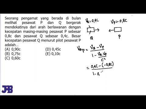Seorang pengamat yang berada di bulan melihat pesawat P dan Q bergerak mendekatinya dari arah berlawanan dengan kecepatan masing-masing pesawat P sebesar 0,8c dan pesawat Q sebesar 0,4c. Besar kecepatan pesawat Q menurut pilot pesawat P adalah…