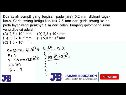 » » Dua celah sempit yang terpisah pada jarak 0,2 mm disinari tegak lurus. Garis terang ketiga ...